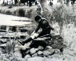 Mad Max Mel Gibson sitting between takes on a rock near the Rothwell Bridge c1979